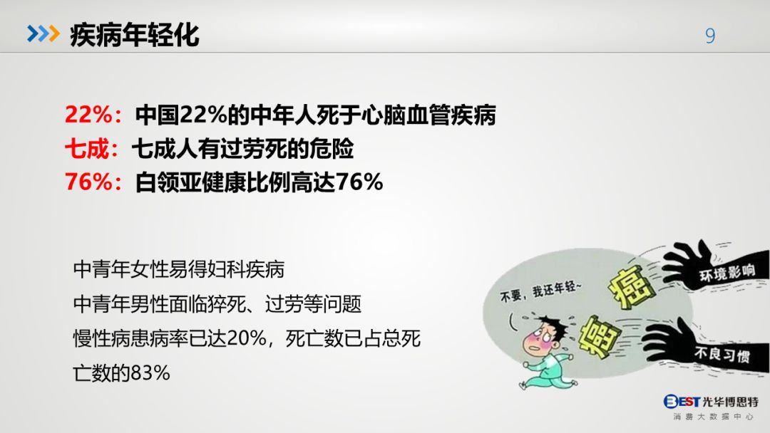 美好的期望有时与现实背道而驰。近几年国人的健康大数据令人担忧。日前发布的《健康管理蓝皮书:中国健康管理与健康产业发展报告(2018)》指出,我国慢性病发病人数在3亿左右,其中65岁以下人群慢性病负担占50%;国家癌症中心发布的《2017中国肿瘤登记年报》显示,我国每年新发癌症病例429万,癌症死亡281万例;《中国城市白领健康状况白皮书》则更加悲观,我国主流城市的白领亚健康比例高达76%,真正意义上的健康人比例不足3%,白领女性更容易受到妇科、心脑血管疾病的威胁,男性则面临猝死、过劳、癌症等疾病。