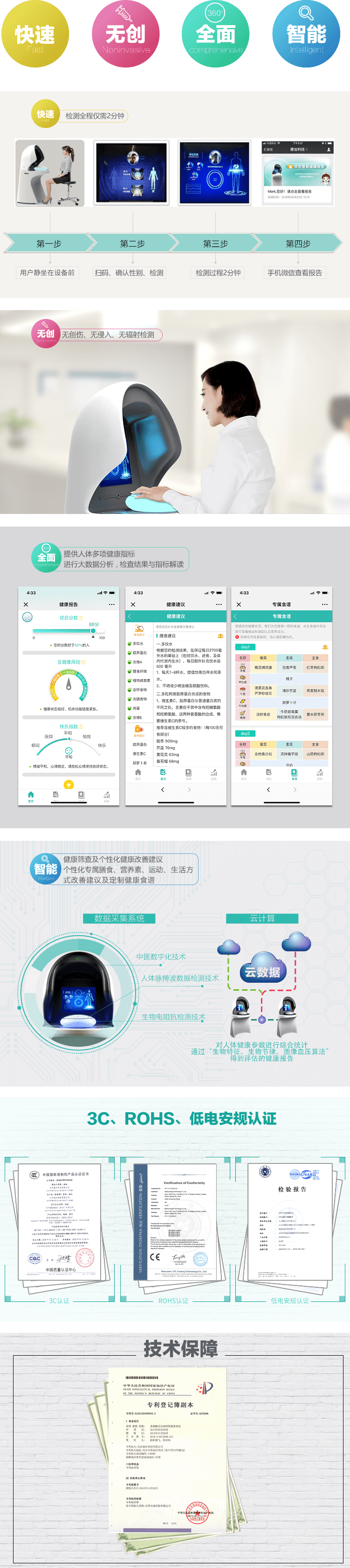PRODUCT INTRODUCTION康加智能筛查机器人,全程自助服务,只需2分钟,快速、无创、全面、智能。通过中医数字化技术、脉搏波检测技术、生物电阻抗检测技术采集人体相关生物数据,通过云端大数据运算及智能分析,一次性给予用户十余项健康指标评估,根据检测结果和预估风险,给予用户健康改善建议和专属健康 改善;为用户生成健康管理档案,可随时查看健康变化趋势,持续辅助用户改善身体状态。